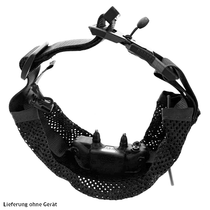 Der Empfänger wird mit dem Klett in die Innenseite des Cover-Halsbandes eingelegt. Die seitlichen Flanken aus Mesh-Material lassen sich über einen Gummizug raffen und legen sich so um die Seiten des Empfängers und schützen ihn perfekt.