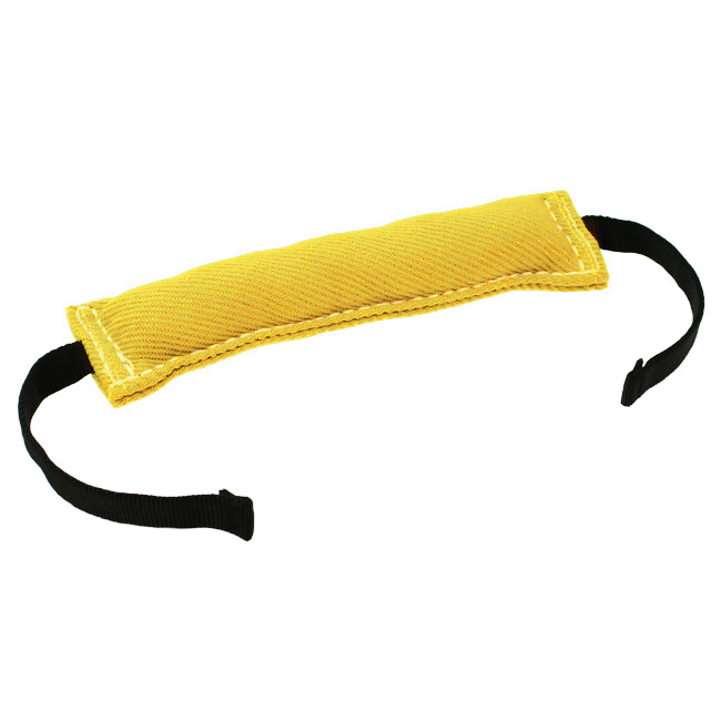 Stabile, harte und farbige Beißwurst aus Nylcot mit zwei Gurtbändern.