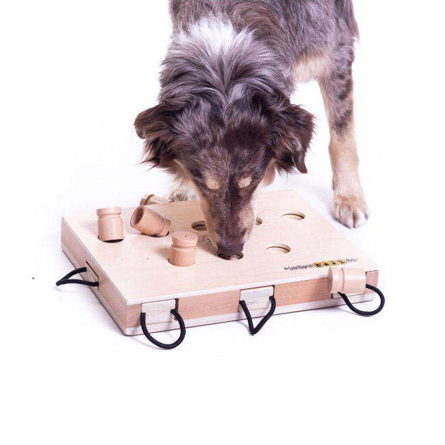 Das Geschicklichkeitsspiel besteht aus zertifiziertem Holz, das mit einer Schicht durchsichtigen und für Mensch und Tier unschädlichen Wasserlack überzogen wurde. Bitte schützen Sie das Spiel vor Feuchtigkeit, da es sonst aufquellen kann. Verwenden Sie zum Spielen nur trockene Hundesnacks.