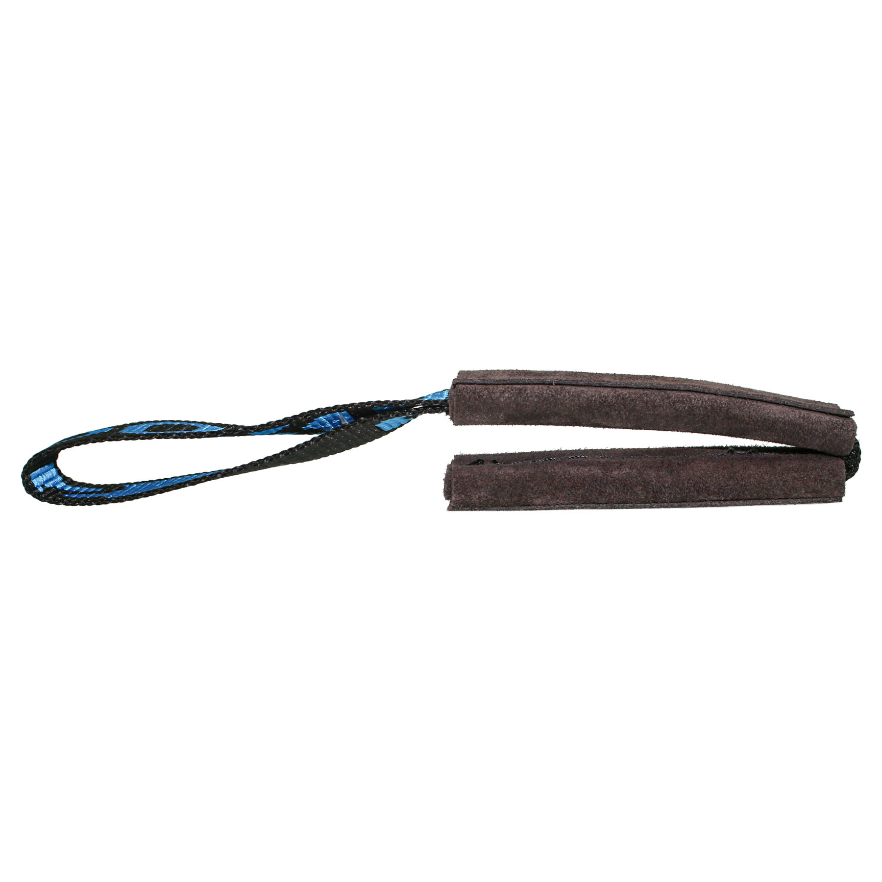 Beißwurst aus mehrfach gewickeltem Leder mit Band in der Mitte und Handschlaufe auf einer Seite. Durch eine mittige Aussparung im Leder lässt sie sich zusammenfalten und platzsparend verstauen. Wird sie losgelassen, klappt sie selbstständig in die volle Form zurück.