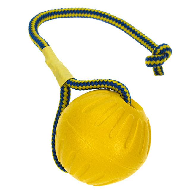 Schwimmfähiger, weicher und trotzdem stabiler Ball aus Schaumstoff mit stabiler Kordel.Maße: