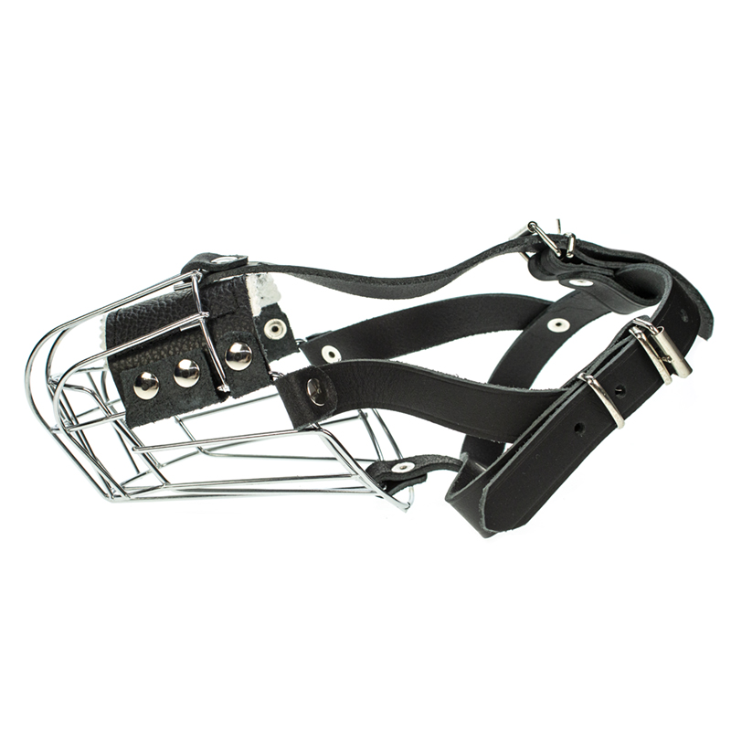 Stabiler Maulkorb bestehend aus einem Drahtkorb mit vernieteten Lederriemen. Eine Polsterung und zusätzliche Riemen sorgen für Komfort und Haltbarkeit.