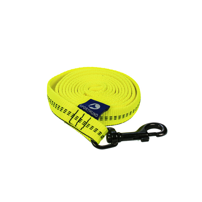In das gelbe Nylonmaterial sind schwarze Applikationen eingewebt. Dadurch erhalten diese Leinen eine extrem gute Giffigkeit, auch bei feuchter Witterung. Bei diesem Sondermodell verarbeiten wir schwarze Edelstahl-Karabiner von der Firma Herm. Sprenger.